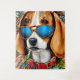 The ultimate in funky retro style, this pupper is sure to make a statement with their bold, colourful style! This playful pup is rocking a pair of oversized sunglasses with a bright pink frame, blue lenses, and purple and orange accents.