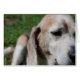 This is a photo of a senior beagle lounging in the yard. Beagles are a laid-back, fun breed of dog, and this cute beagle is no exception.