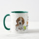 "Beagle puppy kisses fix everything" declares this mug for the Beagle Dog owner. The image on each side is a portrait of an adorable brown and white Beagle puppy. The images and text are placed on a white background that is sprinkled with gold confetti.