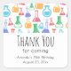 Birthday party thank you stickers with a fun and colourful pattern. Research scientist vibe with beakers and flasks of different shapes and sizes in bright happy colours.