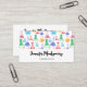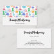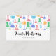 Business cards with a fun and colourful pattern. Research scientist vibe with beakers and flasks of different shapes and sizes in bright happy colours.