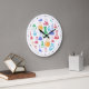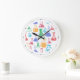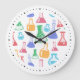 A clock with a fun and colourful pattern. Research scientist vibe with beakers and flasks of different shapes and sizes in bright happy colours.