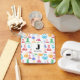 Personalised keychain with a fun and colourful pattern. Research scientist vibe with beakers and flasks of different shapes and sizes in bright happy colours.