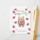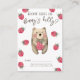 Gender neutral baby shower invitations. Featuring the saying 'WE CAN BEARLY WAIT!', an illustration of a watercolor bear with raspberry in paws, and many red berries. Matching items available.