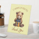 In the centre it has a cute brown bear cub with a big gift with a blue ribbon. Above the bear, the message "Cards & Gifts" is written in arched brown caps. Under it, the message Thank You is written in a brown, curly fancy script. The background is yellow, the bear is brown, the gift is yellow with a blue ribbon.