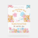 Modern and cute teddy bear theme gender reveal party welcome sign featuring an illustration of two teddy bears with pink and blue bow and balloons The text says She or Hel. we can bearly wait to see"