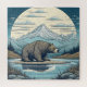 AI art depicting a brown bear by a lake in the mountains with a full moon in the background. Colours used are tan, blue and brown.