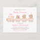 This cute and whimsical baby shower invitation features a watercolor train in pastel pink, yellow and brown with adorable baby bears. The text combines handwritten script and serif fonts for a stylish and modern look. This is perfect for a bear or train themed baby shower.