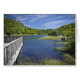A photographic image of the small rural community of Bear River in the Atlantic Canadian province of Nova Scotia located on the East Coast of Canada. This image features a blue river surround by green wetlands grass with a green forest of trees in the background and a vibrant blue sky with some wispy white clouds. In the foreground there is a white deck extending out into the water which drowns your eyes through the image. This image gives a sense of peace, tranquillity and serenity. The feeling of back to nature and relaxation.
