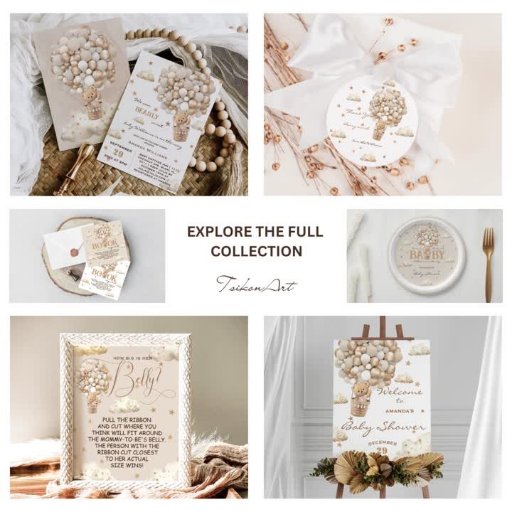 Step into a whimsical hot air balloon adventure with our traveller bear! 🌟 Amidst soft neutral tones and shimmering gold glitter stars, a charming baby teddy gracefully floats in an elegant beige and gold balloon. 🐻🎈 With minimalist design and heartwarming typography, 💖 this tan beige bear thank you card is perfect for your baby shower celebration!