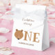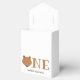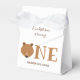 Our little bear is turning one first baby birthday favour boxes. They are white and brown with the word "One" in large letters with a bear face illustration as the first letter of the word. Simply, customise these boxes, add them to your cart, and happy birthday to your wonderful baby!