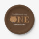 Our little bear is turning one first baby birthday paper plates. These plates are brown and white with the word "One" in large letters with a bear face illustration as the first letter of the word. Simply, customise these plates, add them to your cart, and happy birthday to your wonderful baby!