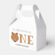 Our little bear is turning one first baby birthday favour boxes. They are white and brown with the word "One" in large letters with a bear face illustration as the first letter of the word. Simply customise these boxes, add them to your cart, and happy birthday to your wonderful baby!