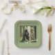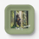 A bear stands leisurely against a tree holding a mug of beer with one paw in a sunlit forest