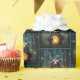 Black bear holding a glass jar filled with glowing fireflies in dark forest.