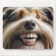 A close-up of a fluffy Bearded Collie dog with long fur humorously shows it grinning with human-like teeth