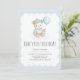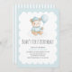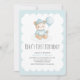 This design features a preppy bear birthday themed "Bear'y First Birthday" with a cute teddy bear in pastel blue baby outfit, a balloon in its hand sitting on a cute cloud, scalloped borders and striped blue and white backside. Perfect for a baby boy's first birthday party. This product can be easily personalised.