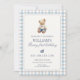 Featuring a charming watercolor teddy bear, soft blue gingham border, and elegant typography, this design is perfect for a timeless and preppy first birthday celebration.