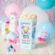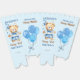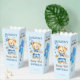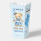 Beary first boys birthday party tableware personalised popcorn favour box, watercolor cute teddy bear dressed up in pant and a bow tie holding a blue balloon party favours blue brown and white colour theme teddy bear popcorn favour box.