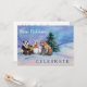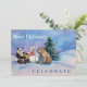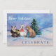 A panda bear, a polar bear, and a brown bear sit holding Christmas holiday gifts on a snow covered field with an evergreen tree in the background. Holiday invitation card message reads "Beary Holidays" and "CELEBRATE". The back of the invitation card has the holiday open house party details. Customise this card with all your own personalised options!