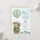 Celebrate your little cub's first birthday with this Beary Sweet woodland-themed invitation! Featuring a cuddly bear in a hoodie and cap holding a soft green balloon with the number "1," this pastel green design brings gentle forest vibes with watercolor mountains, birds, and a cosy outdoor feel. Perfect for baby boys or gender-neutral celebrations, this invite is easy to personalise with your party details.