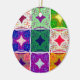 This artwork features a grid-like pattern of nine squares, each containing a unique variation of a central star-like or floral motif set against a chequered or geometric background. The composition is symmetrical and visually busy, emphasising the intricate patterns and variety within each square.
