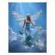 A beautiful silver-haired fairy with iridescent wings and a flowing light blue dress floats above the clouds against a blue sky while pouring water from a pitcher. She represents Aquarius, the water bearer.