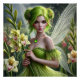 A beautiful yellow-green haired fairy with white wings wearing a pretty chartreuse dress and a peridot necklace holds a single gladiolus while standing in a field of gladioli.
