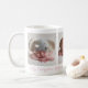 A pretty baby photo mug with your little girl's name in beautiful pink cursive typography below your sweet newborn girl photograph collage. Customise this keepsake gift with your favourite 3 pictures of your new infant.