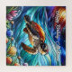 A sweet baby sea turtle with blue eyes swims through the beautiful blue ocean waters. The design is stained glass art inspired.