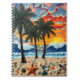Beach art notebook. An impasto oil painting style ai illustration of a beach full of palm trees, sea glass, sea shells and ocean waves at sunset. A bright colourful mesh of colours make this coastal art vibrant and beautiful!