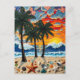 Keep in touch with a friend and say hi with this pretty postcard featuring an impasto oil painting style ai illustration of a beach full of palm trees, sea glass, sea shells and ocean waves at sunset. A bright colourful mesh of colours make this coastal art vibrant and beautiful!