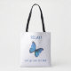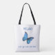 Beautiful big blue Morpho Butterfly on white Tote Bag. Dotted text can be personalised. A blue butterfly is a wishgranter according to many cultures.