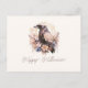 Emblazoned across the top of the postcard are the words "Happy Halloween," elegantly scripted to complement the overall design. The festive greeting adds a touch of whimsy and celebration, making it perfect for spreading Halloween cheer. The combination of the bird, floral elements, and festive text creates a postcard that is both captivating and delightful.