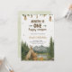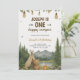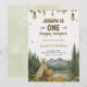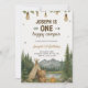 Birthday invitation with a camping theme, featuring a tent, teddy bear, campfire, and mountains. Text reads "Joseph is one happy camper." Forest in background.