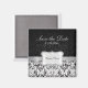 Beautiful and very classy Black and White Damask Save the Date Wedding Magnets. Elegant Black and Metallic Silver Damask wedding patterns.