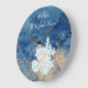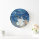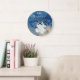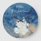 Beautiful, white, faux-golden and sand colour, coastal theme custom wall clock, featuring corals, seahorse, seashell, starfish, on artsy, navy blue watercolor background, designed by theLakeIsland.