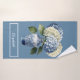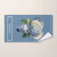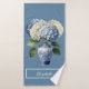 beautiful bouquet of hydrangea flowers arranged in a vase on blue background. The hydrangeas are in shades of light blue and creamy white, with delicate petals that create a full, rounded shape. The vase is a classic white and blue design, likely inspired by traditional porcelain or ceramic styles, with intricate patterns and floral motifs that complement the flowers. The entire scene has a soft, watercolor-like quality, giving it a gentle and elegant appearance. The green leaves of the hydrangea add a natural touch, enhancing the overall composition.