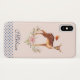 A personalised phone case with a beautiful brown doe with white spots on her fur. A cute bird sitting on the deer's back. An elegant flower arrangement composed of watercolor roses and light green leaves beneath her feet. A blue polka dot border with a peach coloured background. Darling and adorable design.