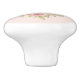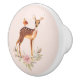 A ceramic knob with a beautiful brown doe with white spots on her fur. A cute bird sitting on the deer's back. An elegant flower arrangement composed of watercolor roses and light green leaves beneath her feet. peach coloured background.