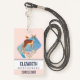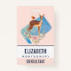 Name badge with a pretty brown deer with a white spotted back. A little bird sitting on the deer's back. A fancy floral bouquet with watercolor roses and light olive green leaves under the deer's feet. A blue watercolor rectangle behind the image. Peach coloured background.
