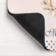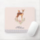 Personalised mousepad with a beautiful brown doe with white spots on her fur. A cute bird sitting on the deer's back. An elegant flower arrangement composed of watercolor roses and light green leaves beneath her feet. A blue polka dot border with a peach coloured background. Darling and adorable design.