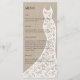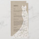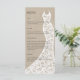 A beautiful lace wedding dress on a burlap background accents this menu for the rustic, country or vintage bridal shower.