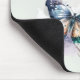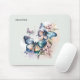 A mouse pad with a trio of butterflies fluttering among some pretty flowers. Blue pink and green colour scheme.