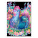 A vibrantly-coloured chicken nests among vining flowers and leaves.