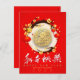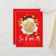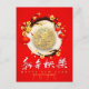 Chinese red lanterns with lucky ideogram and blossoms around a pale pink circle + wishes in Chinese (white modern calligraphy) and in English, Rabbit round golden paper-cut (image printed - model n°1) in the centre of the circle + customisable 2023. Design on holiday postcard with the same pale pink background inside the card. You can easily change background colour. Matching greeting card; Perfect for Chinese Rabbit New Year.
