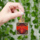 Beautiful key chain with Christmas balls tied with golden ribbons in red background with ornamental borders. perfect gift for your friends and family members.