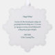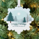 A beautiful winter landscape with teal green pine trees and snow covered ground on personalised business holiday ornament cards. Customise these company Happy Holidays snowflake shaped card with your own corporate message on the back in elegant cursive script.