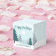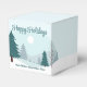 A beautiful winter landscape with teal green pine trees and snow covered ground on a small personalised holiday party favour box. Customise this company Happy Holidays chocolate for your corporate clients or employees.
