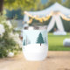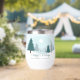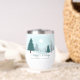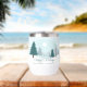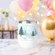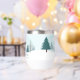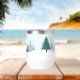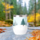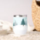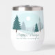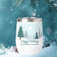 A beautiful winter landscape with teal green pine trees and snow covered ground on a personalised holiday wine tumbler gift. Customise this company Happy Holidays gifts for your corporate clients or employees.